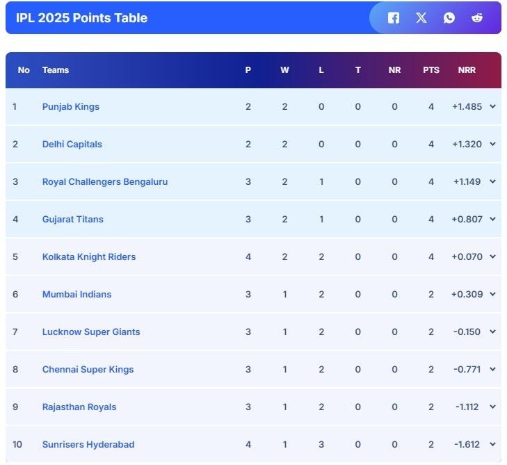 Kolkata Knight Riders registered a massive 80-run win over Sunrisers Hyderabad to jump to fifth spot in the 10-team IPL 2025 points table. In the match at the Eden Gardens in Kolkata on Thursday, everything fell in place for KKR as they overpowered SunRisers Hyderabad. SRH are currently last in the IPL 2025 points table. As far as the highest run-scorer is concerned, Lucknow Super Giants’ Nicholas Pooran holds the Orange Cap with a tally of 189. Chennai Super Kings’ Noor Ahmad holds the Purple Cap with nine scalps.